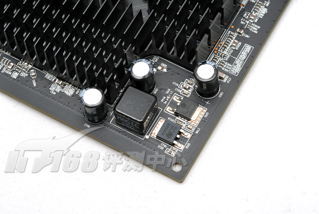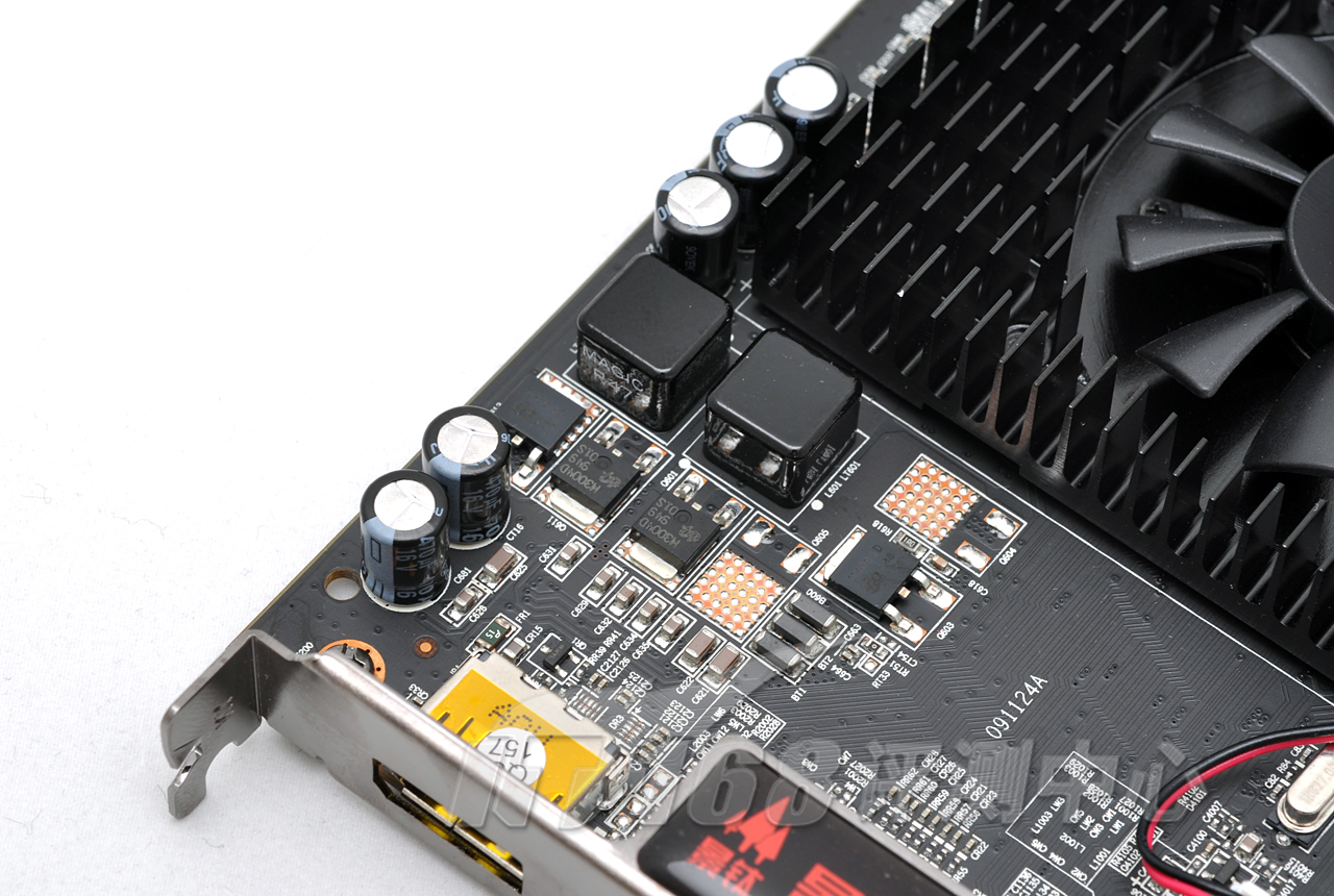 由于GPU核心功耗比较低,对供电的要求并不高,所以只配备了2+1核心与显存分离式的供电设计即可满足HD5570的供电需要。从图上看到有虚焊的MOSFET位置,但大家要注意,并不是用料全都焊上就为好,HD5570的供电需求其实简单的1+1相供电设计也足以满足,所以景钛HD5570的供电设计已经十分足够。