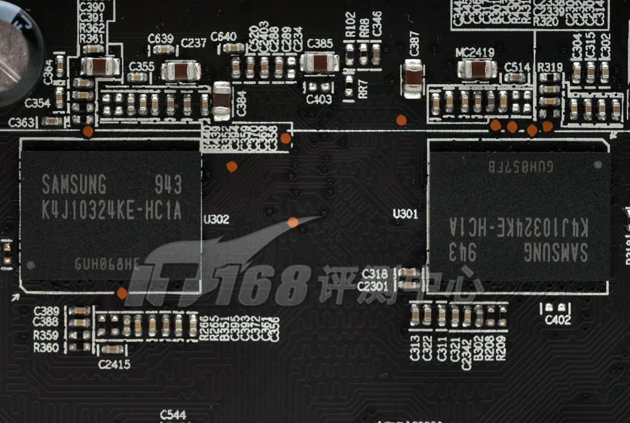 显存方面,景钛HD5570采用了三星的三星HC1A(1.0ns)显存颗粒,正面四颗组成了512M/128bit的显存规格,默认频率为900Mhz,能提供28.8GB/s的显存带宽。