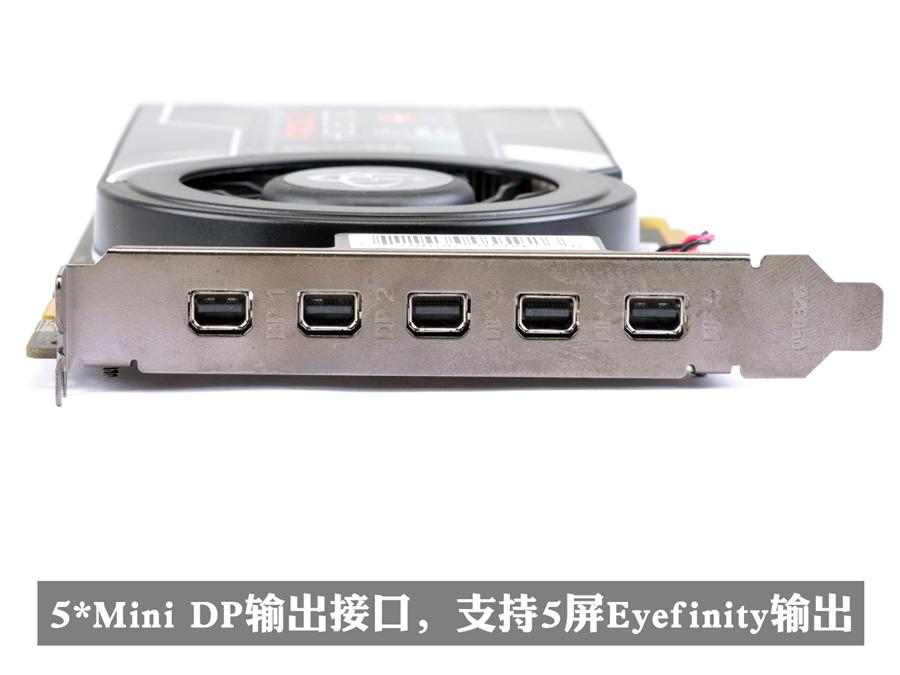 接口方面,XFX(讯景)HD6770 5屏版显卡(HD-677X-Z5),提供有5个Mini Display Port输出接口,支持AMD自家的Eyefinity多屏输出,但可惜附件中并不赠送线材。