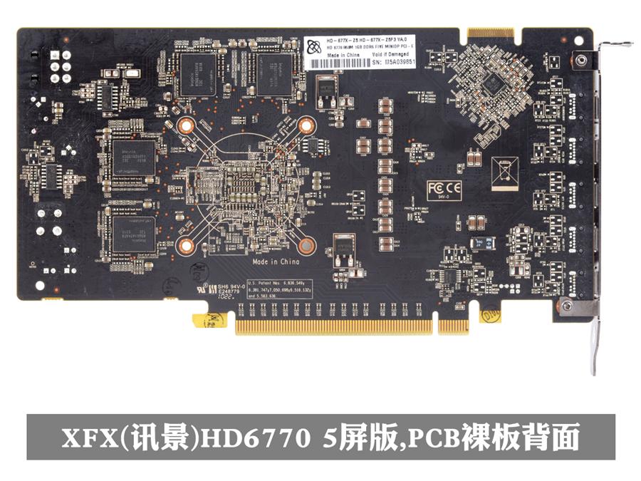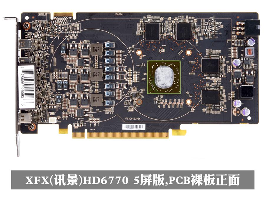 XFX(讯景)HD6770 5屏版显卡(HD-677X-Z5),PCB裸板。由于受单插槽设计的影响,所以核心的供电部分被移到左边,别全都采用了高度较低的贴片元件。而显存供电则被放在右边与外接单6Pin处相邻。