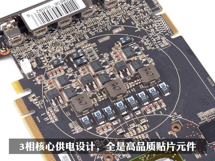 用料方面,XFX(讯景)HD6770 5屏版显卡(HD-677X-Z5)采用了大量的贴片式元件。配备上了豪华的钽电容、MLCC电容、安森美DPAK封装MOSFET和R47全封闭贴片电感。整块显卡仅有四个插件式全固态电容,整块PCB的用料都相当YY。