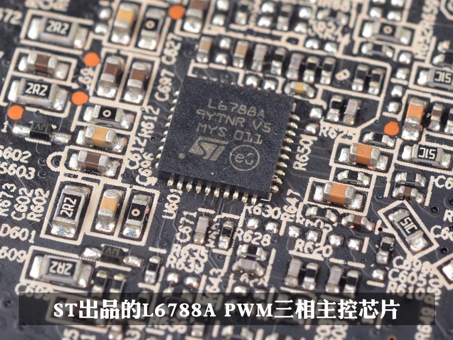 核心供电控制芯片采用的是意法半导体公司(ST)推出的L6788a,支持1-3相PWM供电设计,并内置了驱动IC。