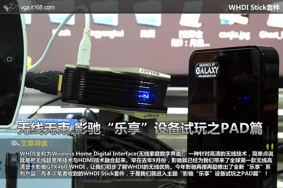WHDI全称为Wireless Home Digital Interface(无线家庭数字界面)。一种针对高清的无线技术,简单点说就是把无线超宽带技术与HDMI技术融合起来。早在去年9月份,影驰就已经为我们带来了全球第一款无线高清显卡影驰GTX460 WHDI,让我们初步看到了WHDI的无线传输优势。今年影驰再接再励推出了全新“乐享”系列产品,而本次笔者收到的WHDI Stick套件,于是我们就进入主题“影驰“乐享”设备试玩之PAD篇”!