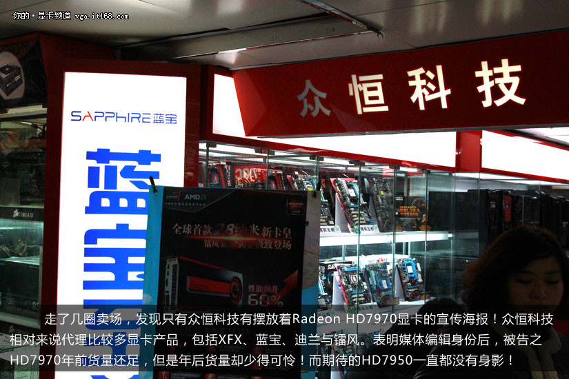 走了几圈卖场,发现只有众恒科技有摆放着Radeon HD7970显卡的宣传海报!众恒科技相对来说代理比较多显卡产品,包括XFX、蓝宝、迪兰与镭风。表明媒体编辑身份后,被告之HD7970年前货量还足,但是年后货量却少得可怜!而期待的HD7950一直都没有身影!