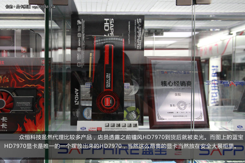 众恒科技虽然代理比较多产品,店员透露之前镭风HD7970到货后就被卖光。而图上的蓝宝HD7970显卡是唯一的一个摆放出来的HD7970,当然这么昂贵的显卡当然放在安全大展柜里。