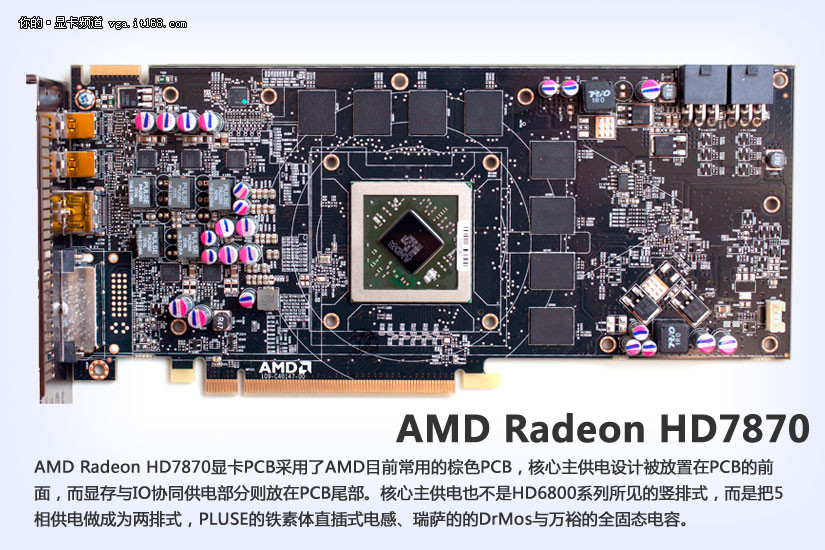 AMD Radeon HD7870显卡PCB采用了AMD目前常用的棕色PCB,核心主供电设计被放置在PCB的前面,而显存与IO协同供电部分则放在PCB尾部。核心主供电也不是HD6800系列所见的竖排式,而是把5相供电做成为两排式,PLUSE的铁素体直插式电感、瑞萨的的DrMos与万裕的全固态电容。