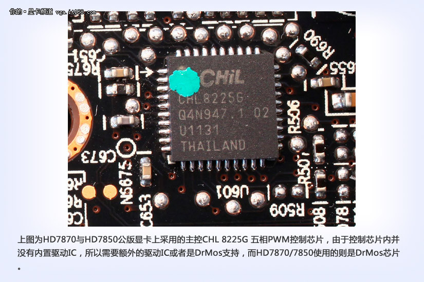 上图为HD7870与HD7850公版显卡上采用的主控CHL 8225G 五相PWM控制芯片,由于控制芯片内并没有内置驱动IC,所以需要额外的驱动IC或者是DrMos支持,而HD7870/7850使用的则是DrMos芯片。