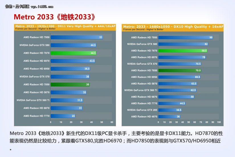 Metro 2033《地铁2033》新生代的DX11级PC显卡杀手,主要考验的是显卡DX11能力。HD7870的性能表现仍然是比较给力,紧跟着GTX580,完胜HD6970;而HD7850的表现则与GTX570/HD6950相近。