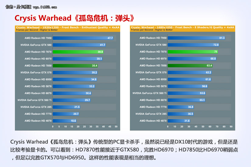 Crysis Warhead《孤岛危机:弹头》传统型的PC显卡杀手,虽然说已经是DX10时代的游戏,但是还是比较考验显卡的。可以看到:HD7870性能接近于GTX580,完胜HD6970;HD7850比HD6970稍弱点,但足以完胜GTX570与HD6950。这样的性能表现是相当的理想。