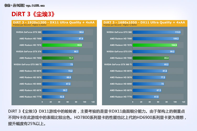 DiRT 3《尘埃3》DX11游戏中的皎皎者,主要考验的是显卡DX11曲面细分能力。由于架构上的侧重点不同N卡在此游戏中的表现比较出色。HD7800系列显卡的性能也比上代的HD6900系列显卡更为理想,提升幅度有25%以上。