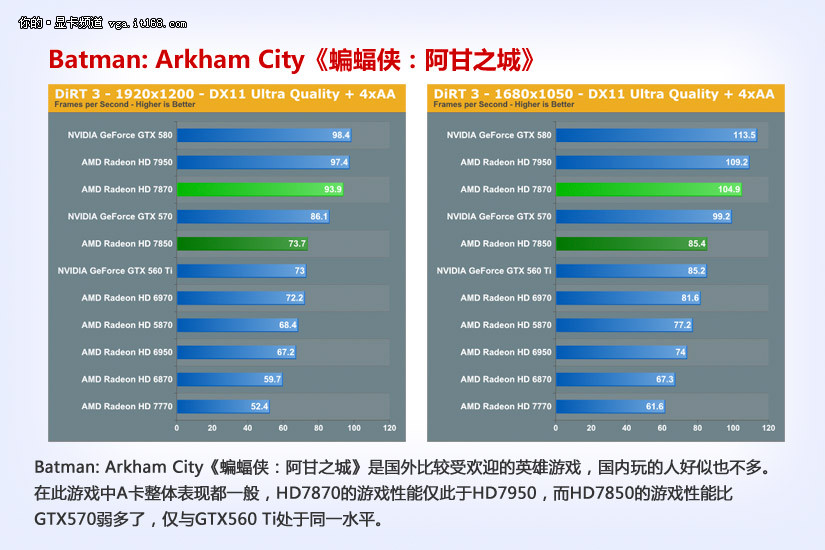 Batman: Arkham City《蝙蝠侠:阿甘之城》是国外比较受欢迎的英雄游戏,国内玩的人好似也不多。在此游戏中A卡整体表现都一般,HD7870的游戏性能仅此于HD7950,而HD7850的游戏性能比GTX570弱多了,仅与GTX560 Ti处于同一水平。