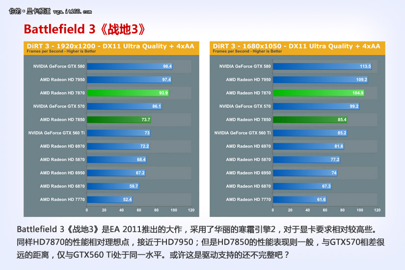 Battlefield 3《战地3》是EA 2011推出的大作,采用了华丽的寒霜引擎2,对于显卡要求相对较高些。同样HD7870的性能相对理想点,接近于HD7950;但是HD7850的性能表现则一般,与GTX570相差很远的距离,仅与GTX560 Ti处于同一水平。或许这是驱动支持的还不完整吧?