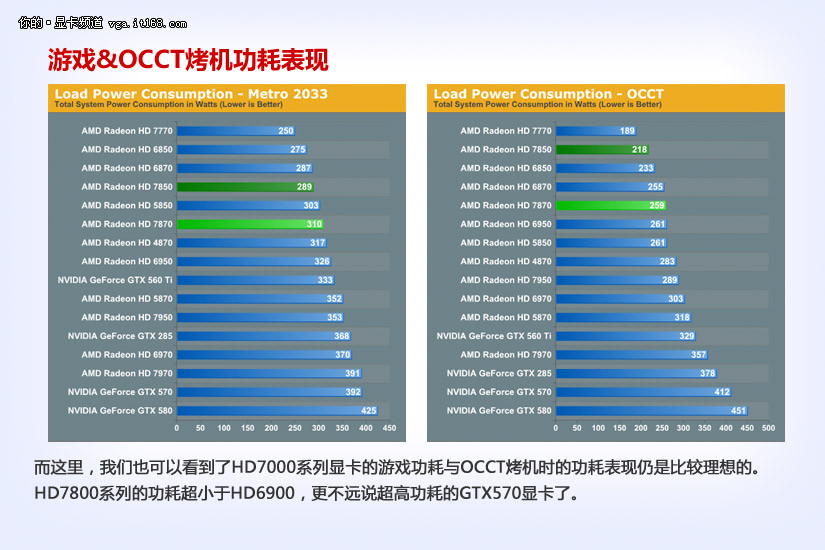 而这里,我们也可以看到了HD7000系列显卡的游戏功耗与OCCT烤机时的功耗表现仍是比较理想的。HD7800系列的功耗超小于HD6900,更不远说超高功耗的GTX570显卡了。