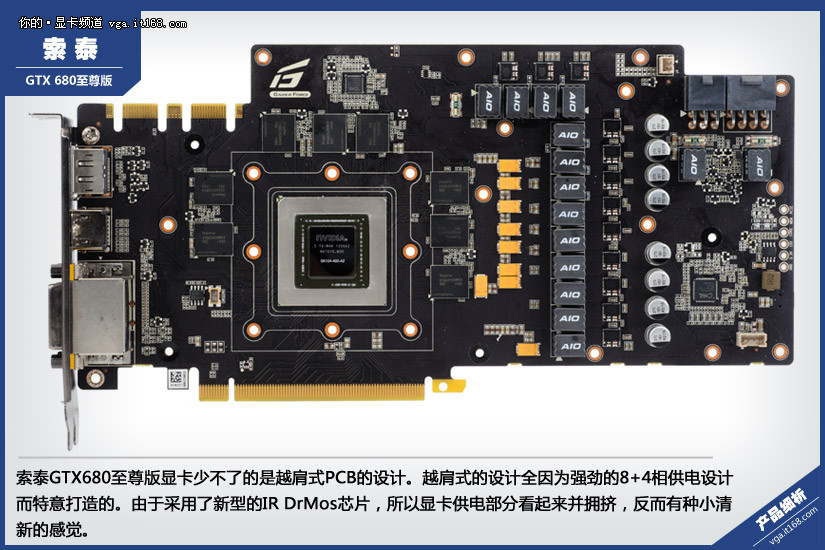 索泰GTX680至尊版显卡少不了的是越肩式PCB的设计。越肩式的设计全因为强劲的8+4相供电设计而特意打造的。由于采用了新型的IR DrMos芯片,所以显卡供电部分看起来并拥挤,反而有种小清新的感觉。