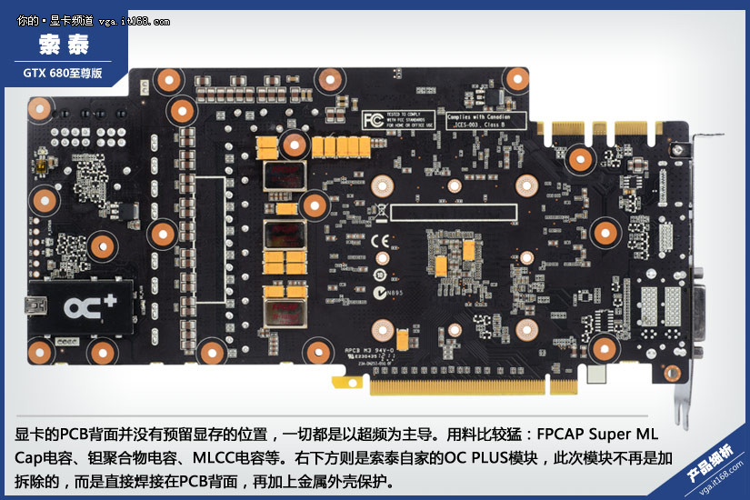 显卡的PCB背面并没有预留显存的位置,一切都是以超频为主导。用料比较猛:FPCAP Super ML Cap电容、钽聚合物电容、MLCC电容等。右下方则是索泰自家的OC PLUS模块,此次模块不再是加拆除的,而是直接焊接在PCB背面,再加上金属外壳保护。
