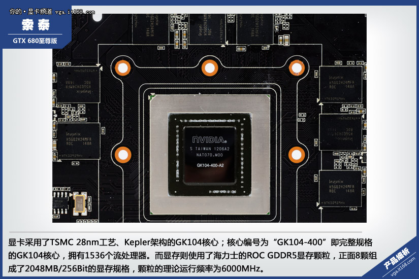 显卡采用了TSMC 28nm工艺、Kepler架构的GK104核心;核心编号为“GK104-400”即完整规格的GK104核心,拥有1536个流处理器。而显存则使用了海力士的ROC GDDR5显存颗粒,正面8颗组成了2048MB/256Bit的显存规格,颗粒的理论运行频率为6000MHz。