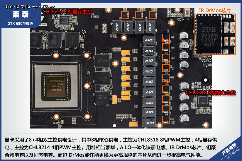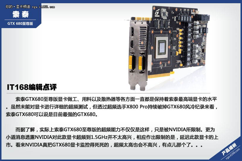 正因为公版GTX680的PCB、供电设计、散热等的不给力,所以各大AIC厂商都抢先在第一时间展示自家的非公版产品,力求获得各网友的好印象。作为核心AIC的索泰,也拿出了其能够风冷超频超到1.5G的新旗舰——索泰680至尊版。