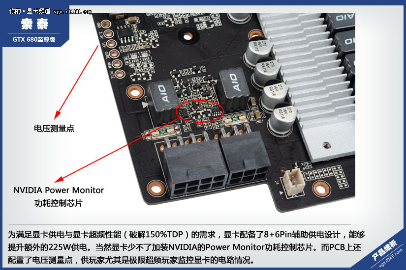 为满足显卡供电与显卡超频性能(破解150%TDP)的需求,显卡配备了8+6Pin辅助供电设计,能够提升额外的225W供电。当然显卡少不了加装NVIDIA的Power Monitor功耗控制芯片。而PCB上还配置了电压测量点,供玩家尤其是极限超频玩家监控显卡的电路情况。