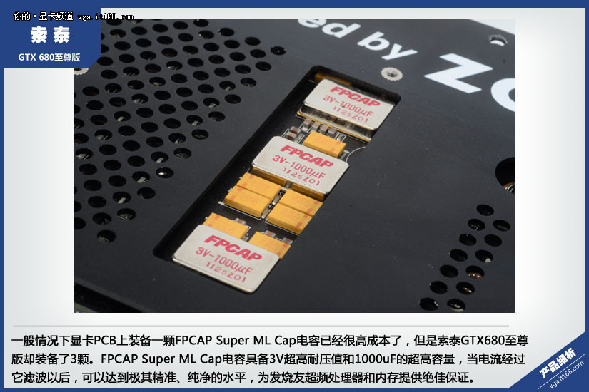 一般情况下显卡PCB上装备一颗FPCAP Super ML Cap电容已经很高成本了,但是索泰GTX680至尊版却装备了3颗。FPCAP Super ML Cap电容具备3V超高耐压值和1000uF的超高容量,当电流经过它滤波以后,可以达到极其精准、纯净的水平,为发烧友超频处理器和内存提供绝佳保证。