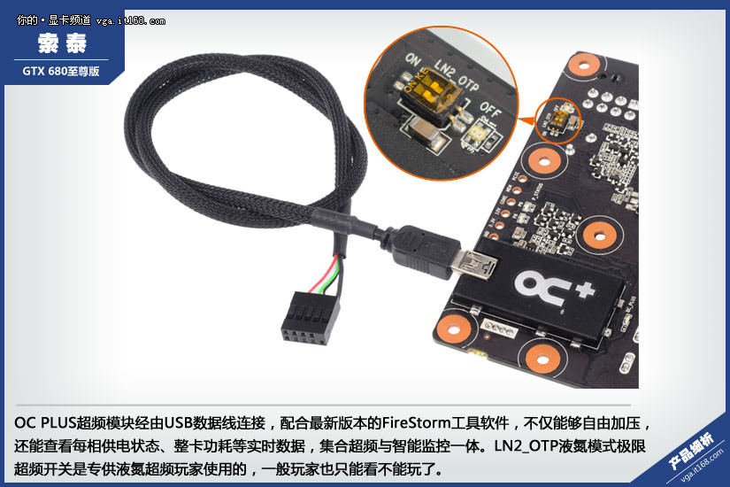 OC PLUS超频模块经由USB数据线连接,配合最新版本的FireStorm工具软件,不仅能够自由加压,还能查看每相供电状态、整卡功耗等实时数据,集合超频与智能监控一体。LN2_OTP液氮模式极限超频开关是专供液氮超频玩家使用的,一般玩家也只能看不能玩了。