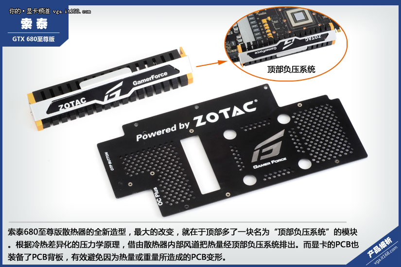 索泰680至尊版散热器的全新造型,最大的改变,就在于顶部多了一块名为“顶部负压系统”的模块。根据冷热差异化的压力学原理,借由散热器内部风道把热量经顶部负压系统排出。而显卡的PCB也装备了PCB背板,有效避免因为热量或重量所造成的PCB变形。