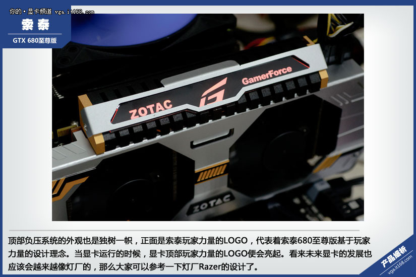 顶部负压系统的外观也是独树一帜,正面是索泰玩家力量的LOGO,代表着索泰680至尊版基于玩家力量的设计理念。当显卡运行的时候,显卡顶部玩家力量的LOGO便会亮起。看来未来显卡的发展也应该会越来越像灯厂的,那么大家可以参考一下灯厂Razer的设计了。