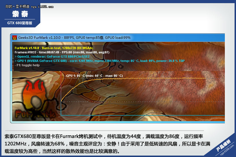 索泰GTX680至尊版显卡在Furmark烤机测试中,待机温度为44度,满载温度为86度,运行频率1202MHz,风扇转速为68%,噪音主观评定为:安静!由于采用了是低转速的风扇,所以显卡在满载温度较为高些,当然这样的散热效能也是比较满意的。