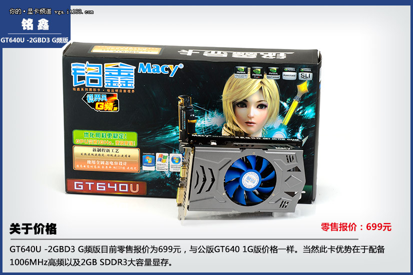 GT640U -2GBD3 G频版目前零售报价为699元,与公版GT640 1G版价格一样。当然此卡优势在于配备1006MHz高频以及2GB SDDR3大容量显存。