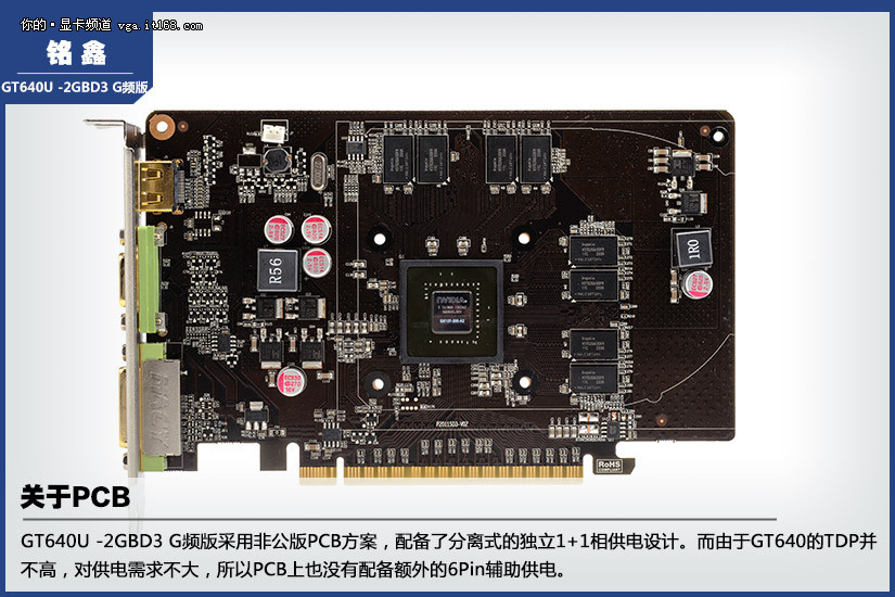 GT640U -2GBD3 G频版采用非公版PCB方案,配备了分离式的独立1+1相供电设计。而由于GT640的TDP并不高,对供电需求不大,所以PCB上也没有配备额外的6Pin辅助供电。