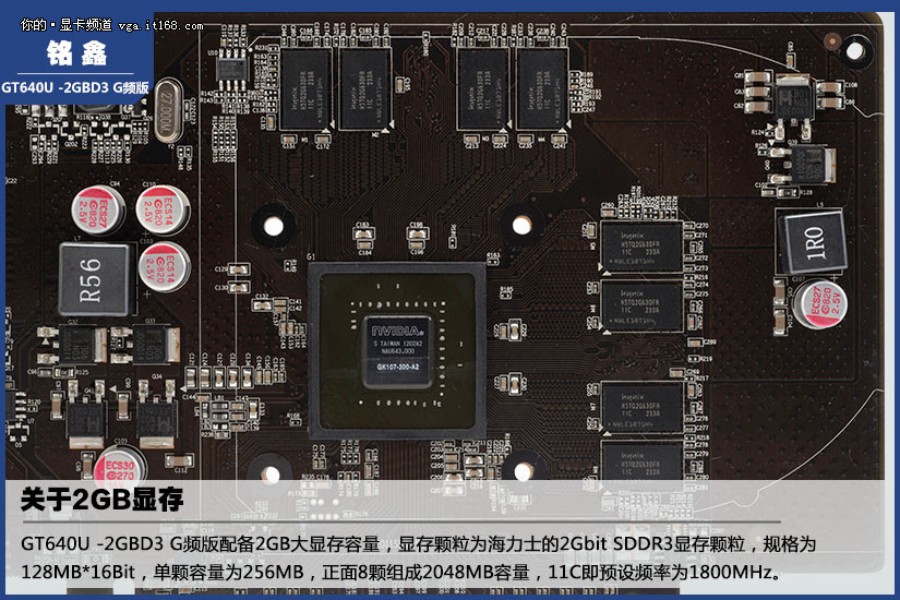 GT640U -2GBD3 G频版配备2GB大显存容量,显存颗粒为海力士的2Gbit SDDR3显存颗粒,规格为128MB*16Bit,单颗容量为256MB,正面8颗组成2048MB容量,11C即预设频率为1800MHz。