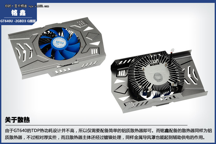由于GT640的TDP热功耗设计并不高,所以仅需要配备简单的铝质散热器即可。而铭鑫配备的散热器同样为铝质散热器,不过相对厚实些,而且散热器主体还经过镀镍处理,同样金属导风罩也能起到辅助供电的作用。