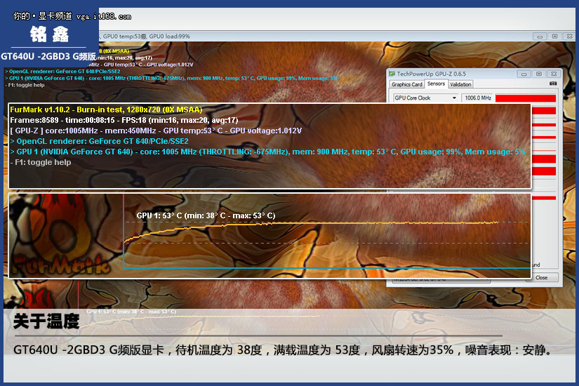GT640U -2GBD3 G频版显卡,待机温度为 38度,满载温度为 53度,风扇转速为35%,噪音表现:安静。