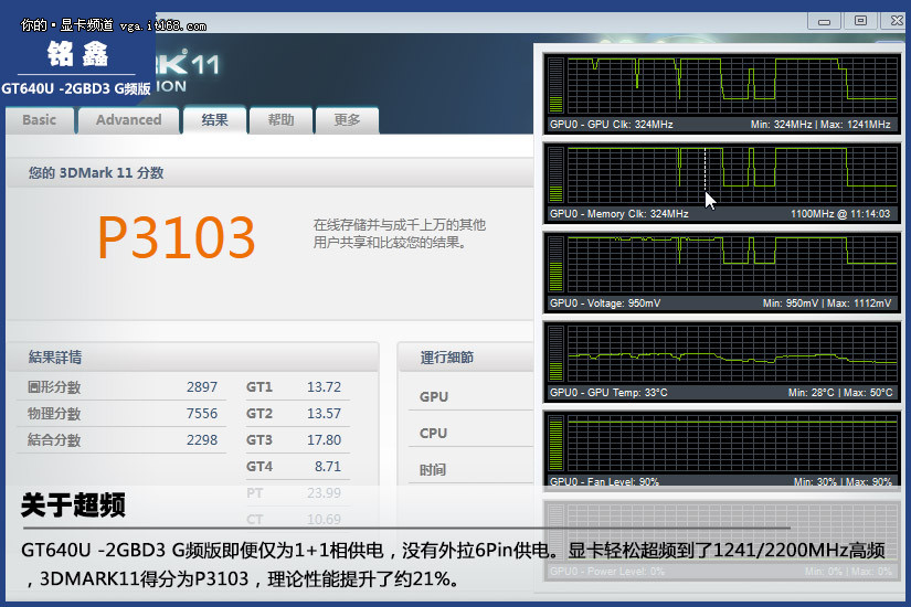 GT640U -2GBD3 G频版即便仅为1+1相供电,没有外拉6Pin供电。显卡轻松超频到了1241/2200MHz高频,3DMARK11得分为P3103,理论性能提升了约21%。
