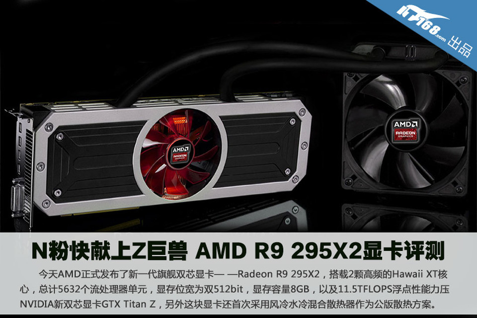 今天AMD正式发布了新一代旗舰双芯显卡— —Radeon R9 295X2,搭载2颗高频的Hawaii XT核心,总计5632个流处理器单元,显存位宽为双512bit,显存容量8GB,以及11.5TFLOPS浮点性能力压NVIDIA新双芯显卡GTX Titan Z,另外这块显卡还首次采用风冷水冷混合散热器作为公版散热方案。